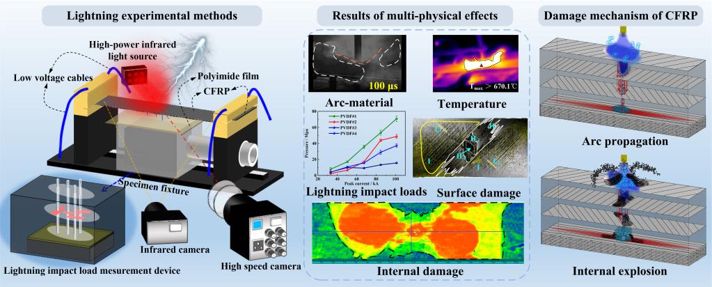 碳纤维增强型聚合物(CFRP)复合材料因其具有低密度、高比模量、高比强度等优异的力学性能,被广泛应用于飞机的结构制造中。雷击事件严重威胁飞机的飞行安全,已然成为大飞机轻量化进程的关键难题之一。雷击是一个包含强电、热、力场效应的强耦合复杂过程,雷击引起的力学冲击是引起CFRP复合材料结构损伤的关键因素,高电压、大电流、强电磁、极高温的复杂雷电环境给雷电冲击压力测量、雷电冲击载荷和雷击...
