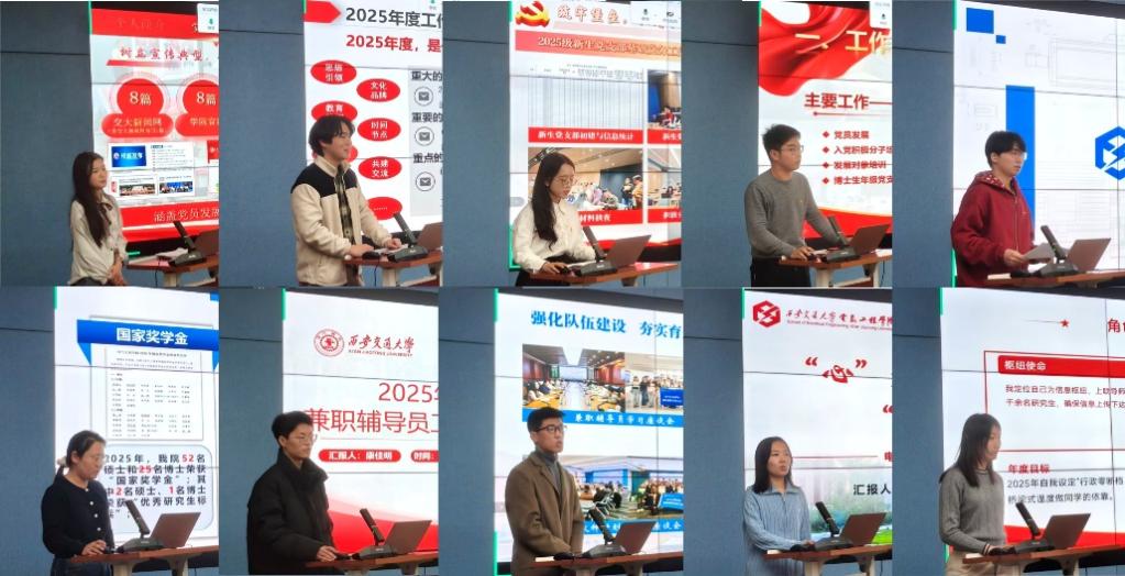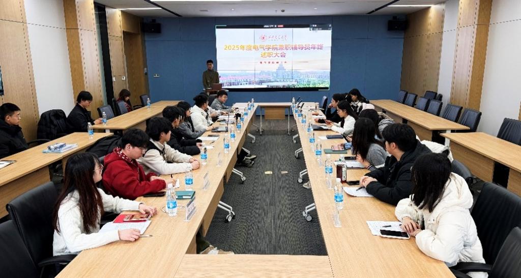 为落实立德树人根本任务,进一步加强学院研究生兼职辅导员队伍建设,全面回顾总结2025年度工作成果,展望谋划2026年重点工作,1月14日,电气学院召开2025年度兼职辅导员年终述职会议。电气学院辅导员程亚龙、刘涛、柴冠坤、王凯和齐蔓梓,全体兼职辅导员线上线下结合形式参会。会议由兼职辅导员吴必克主持。