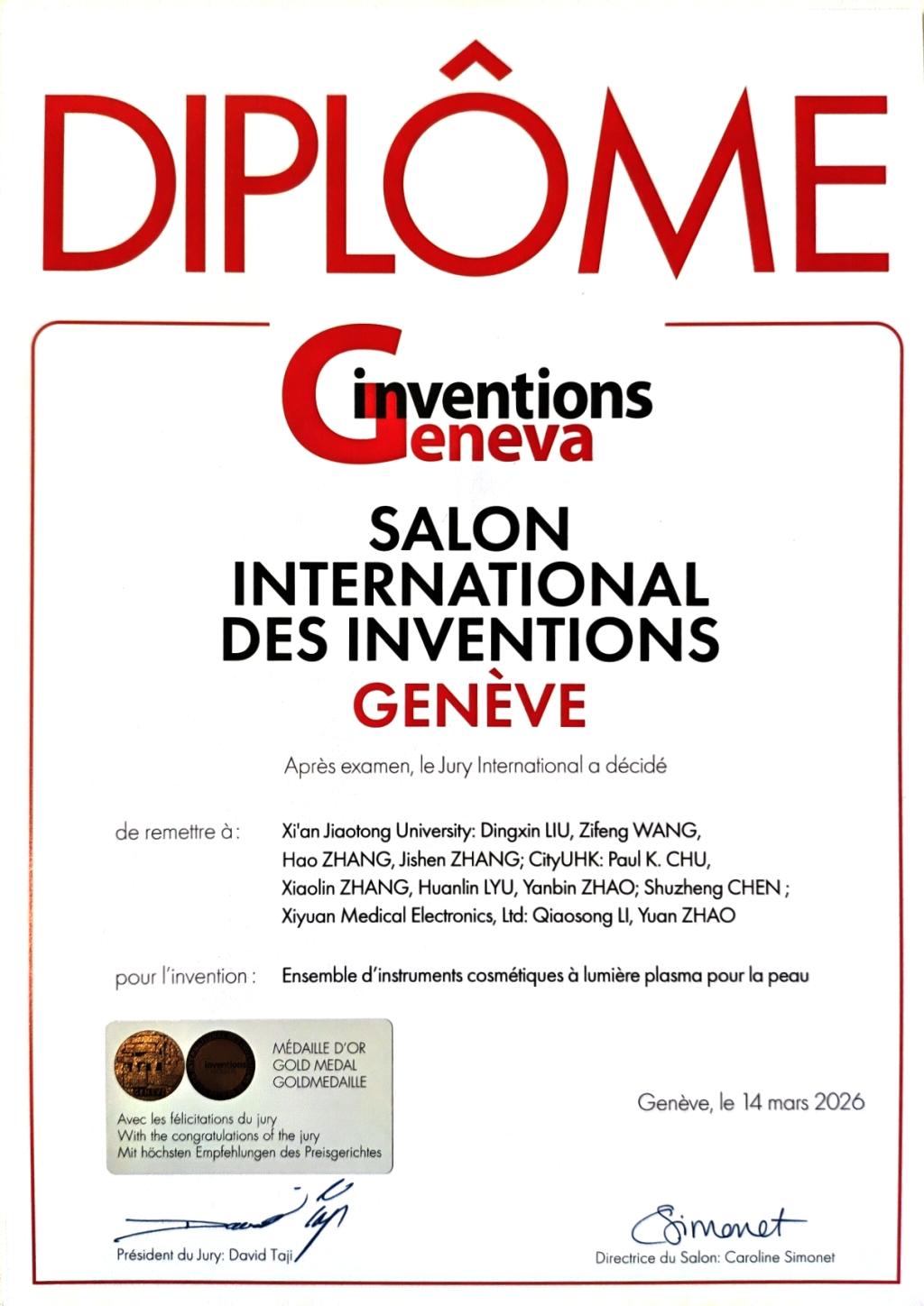 3月11日至15日,第51届日内瓦国际发明展在瑞士日内瓦举行,全球35个国家和地区的1000多个发明项目参展。西安交通大学电气学院等离子体生物医学研究中心的参展项目“等离子轻肤美容仪套装”(Plasma Light Skin Cosmetic Instrument Suit)脱颖而出,获得评审团特别嘉许金奖(Gold Medal with the Congratulations of the Jury)。该奖项需从金奖中遴选并经评审团全票通过,是日内瓦国际发明展的最高荣誉。