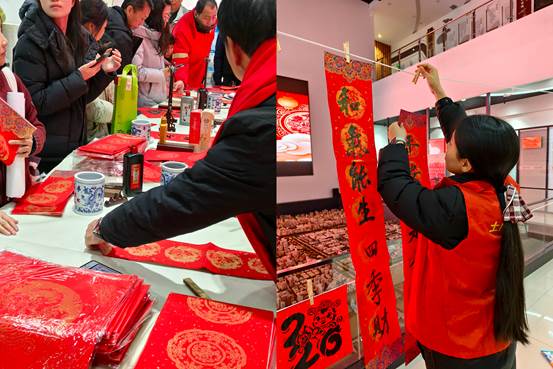 墨香四溢、红纸映喜。实践团队与社区居民共同围在案前观看书法老师挥毫泼墨,将对新春的祝愿写入一副副春联与“福”字之中。现场队员协助铺纸、递墨、晾放作品,提醒参与者有序取联,帮助大家把“写出来的祝福”带回家。红联在手、喜笑颜开,挂起的不只是节日仪式感,更是对来年阖家安康、福暖四季的共同期盼。