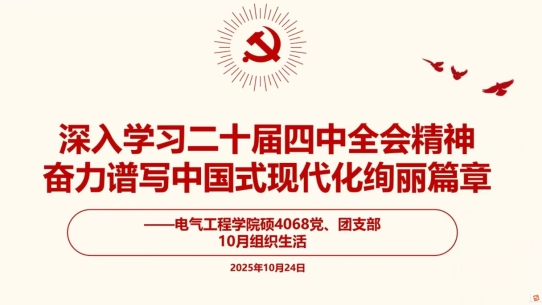 结合电气工程专业特色,硕4068党支部将进一步深度推进产学研融合发展,聚焦国家能源安全与“双碳”目标等重大需求,积极引导同学们在学习中思考电力系统智能化、先进化、稳健化、绿色化的创新路径。支部将鼓励同学们将课堂知识与科研创新紧密结合,关注新能源消纳、电网构网储能、智能调控与电能质量提升等前沿领域,努力在推动构建新型电力系统的实践中贡献青春力量。