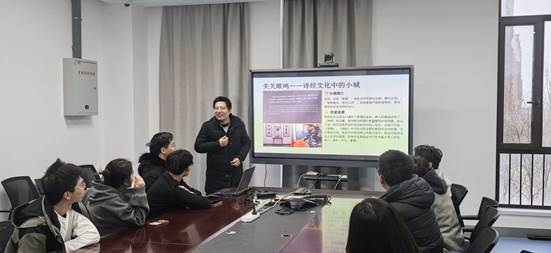 吴桐蹊同学分享主题为“关关雎鸠:诗经文化中的小城”。队长吴桐蹊同学则带领大家走进了陕西合阳。他结合在合阳历史文化博物馆的调研,生动讲述了这座古称“莘国”的小城与《诗经》开篇《关雎》的深厚渊源。通过梳理周代青铜器残片和“中华厨祖”伊尹的故里文化,他探讨了地域文化助力乡村振兴的现代路径,展现了新时代青年对传统文化活态传承的深度思考。
