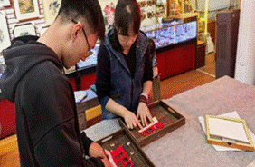 知是行之始,行是知之成。参观结束后,同学们满怀热忱投入实践环节,分成剪纸、拓片和漆扇三个小组,在工作人员的指导下亲自动手体验非遗制作。