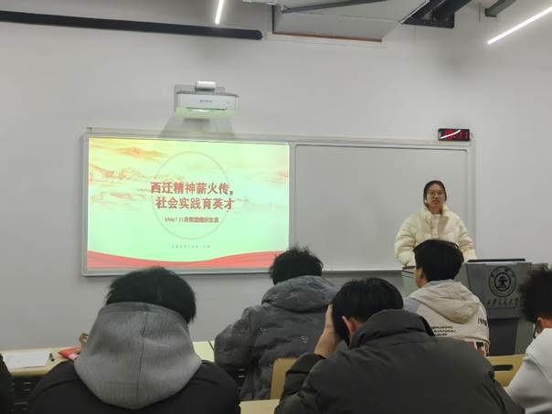 为进一步赓续红色基因、厚植家国情怀,支部开展了“西迁精神薪火传,社会实践育英才”专题宣讲。张悦同志围绕西迁精神,从“历史缘起——坚定信仰之迁”“时代使命——服务国家之迁”“青年担当——投身实践之迁”三个维度入手,带领同学们重温西安交通大学“胸怀大局、无私奉献、弘扬传统、艰苦创业”的精神谱系。通过展示西迁历程影像、讲述前辈故事、分享基层社会实践经历等方式,引导同学们深刻理解老一辈交大人在国家战略决策中主动选择、勇担使命的时代胸襟,感悟把个人奋斗融入国家发展大局的价值追求。