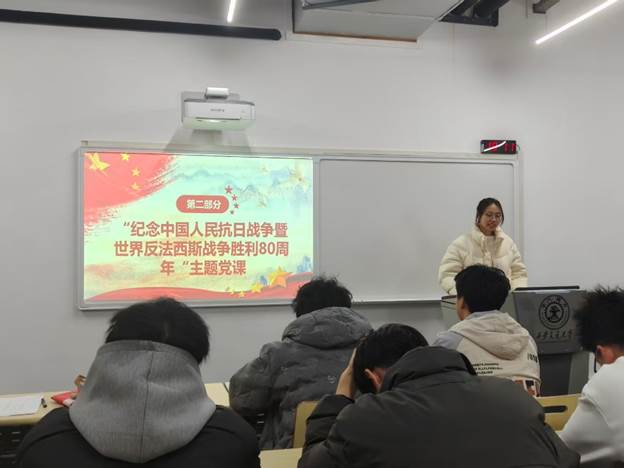 随后,支部以“传承红色基因 汲取奋进力量——纪念中国人民抗日战争暨世界反法西斯战争胜利80周年”为主题开展党课学习。张悦同志通过回顾烈士纪念日向人民英雄敬献花篮仪式等重大纪念活动,重温狼牙山五壮士、东北抗联八女投江等英雄事迹,带领同学们深切体会革命先烈以鲜血和生命铸就的伟大抗战精神。