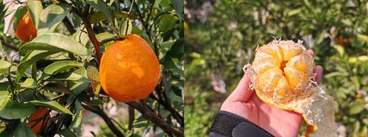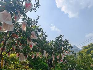 文先生告诉我们,他于6年前开始种植果树。果园占地十余亩,种有耙耙柑树千余株、果冻橙树三百余株。沿山路向上,可见鸡舍猪圈。农场实行种养结合:果树每年3、6、9月施用天然农家肥,这些肥料正来自自养家禽家畜;品相欠佳的剩余果实则成为饲料。粪便发酵后回归果园,形成“果—畜—肥”的有机闭环。灌溉用水引自山泉,因地制宜降低成本。