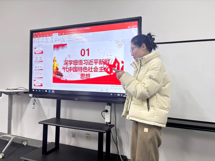会议伊始,宣传委员张雯宁带领大家系统回顾了上学期以来持续学习的习近平新时代中国特色社会主义思想。这是筑牢思想根基、把准政治方向的核心,是我们新时代青年成长成才的根本遵循。通过总结提炼,同学们从“十个明确”“十四个坚持”“十三个方面成就”等维度,进一步深刻领会了这一思想的核心要义、精神实质与丰富内涵。