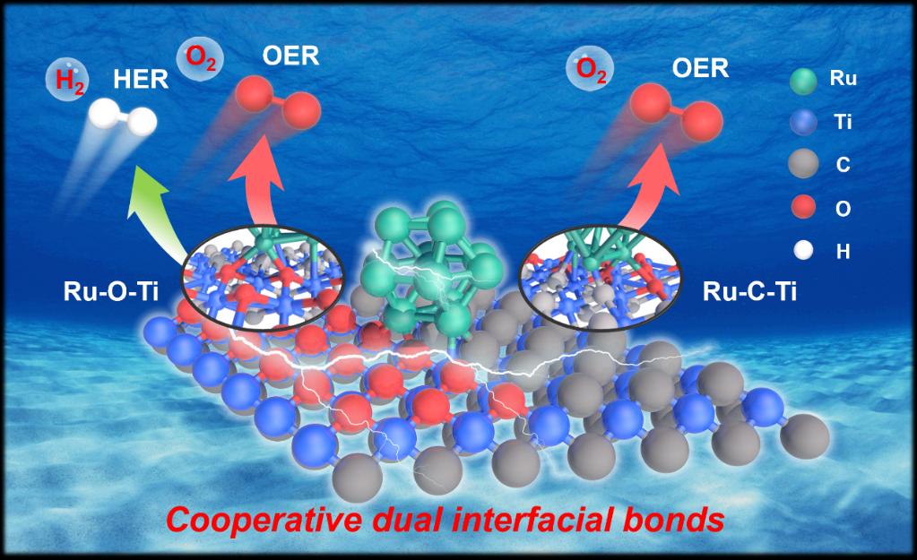 近日,西安交大电气工程学院、电工材料电气绝缘全国重点实验室相关科研团队成功研制出 Ru/Ti3C2Ox@NF 海水电解双功能电催化剂。该催化剂以泡沫镍为基底,通过精准电沉积技术将超低负载量钌团簇锚定在Ti3C2Ox纳米片表面,形成 “活性位点——导电骨架” 紧密结合的复合结构。此设计让催化剂兼具出色电催化活性与超强结构稳定性,其优异性能源于独特的界面键合作用:Ti3C2Ox的氧、碳端基分别与钌团簇形成 Ru–O–Ti 和 Ru–C–Ti 键,两键协同引导界面电荷定向重分布,既优化了反应中间体吸附能力,又加快了析氢、析氧反应动力学。该研究突破了海水电解催化剂活性与稳定性难兼顾的瓶颈,阐明了界面键合的调控机制,为复杂电解质环境高效双功能电催化剂的开发提供了新思路。