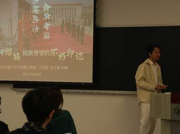 团支书王智鑫同学则带领大家回顾九三阅兵的震撼场景。她通过分享阅兵式中的经典画面,向同学们展现了中国国防力量的强大与国家的繁荣昌盛。与此同时,她还将阅兵式中的细节与抗日战争的历史相结合,让同学们更加深刻地认识到,今日国家的蓬勃发展与繁荣强盛,离不开抗战前辈们的浴血奋战与无私奉献。她提到,九三阅兵不仅是对历史的纪念、对英烈的致敬,更彰显了中国维护和平、捍卫主权的坚定决心。她呼吁同学们从阅兵精神中汲取力量,将个人理想与国家发展紧密结合,以实际行动传承红色基因。