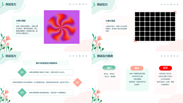 为帮助同学们量化自身压力水平,班会设置了趣味与实用兼具的压力测试环节。通过静态图片观察测试,同学们可根据图片的转动速度初步判断压力大小;同时,班会还提供了多维度的情绪与行为评估标准,从情绪状态、学习兴趣、睡眠质量、自我认知等方面,将压力程度划分为“绿灯”(状态良好)、“黄灯”(存在一定压力)和“红灯”(压力严重)三个等级,让同学们能够清晰了解自身心理状态,及时发现潜在问题。