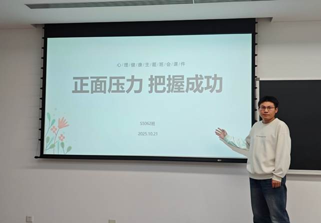 10月22日,硕5062班在西安交通大学创新港校区1-4056教室举行了以“正面压力,把握成功”为主题的心理健康班会。为帮助同学们科学认知压力、有效管理压力,以积极心态应对学习科研与生活中的各类挑战,班会围绕压力的认知、来源、测试及缓解方法等核心内容展开,为全班同学送上了一场实用且暖心的心理赋能盛宴,会议由心理委员李新宇主持。